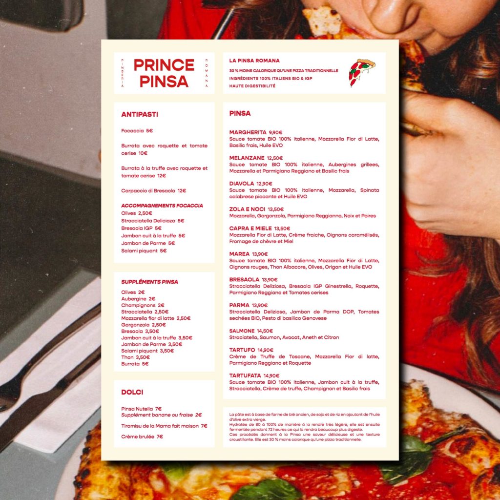 Prince Pinsa est un restaurant parisien dédié à la Pinsa Romana, une spécialité italienne authentique à la croûte fine, croustillante et moelleuse à la fois. Chaque recette célèbre l’excellence des produits italiens , choisis pour leur goût et leur authenticité. Prince Pinsa, c’est l’art de la simplicité italienne : généreuse, sincère et savoureuse.